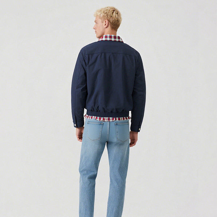 This men's bomber jacket features a button-up front with a contrast collar and hem. Designed with a plaid interior, it blends a casual streetwear style with a classic look suitable for everyday wear in cooler seasons.
